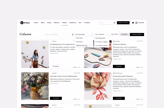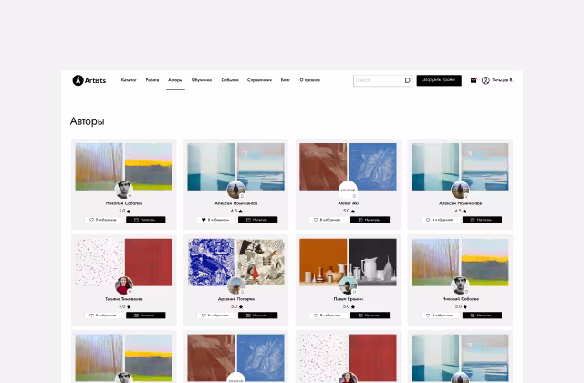 В разделе «Авторы» каждый сможет ознакомиться с художниками — Авторами в сфере изобразительного искусства, которые зарегистрированы на платформе, посмотреть их портфолио и предложить сотрудничество.