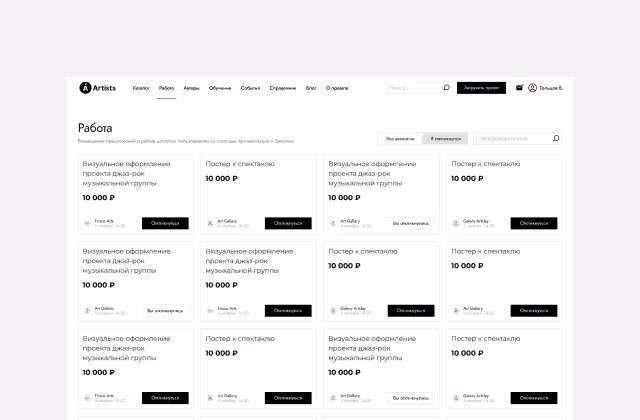 Раздел «Работа» предоставляет информацию о вакансиях по направлениям, а также обновляемую ленту объявлений работодателей по поиску исполнителей индивидуальных заказов во всех сферах креативных индустрий, связанных с художниками.